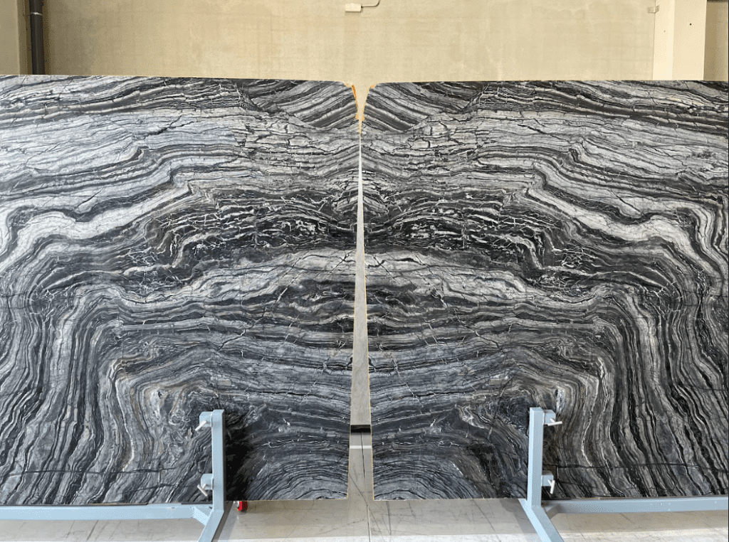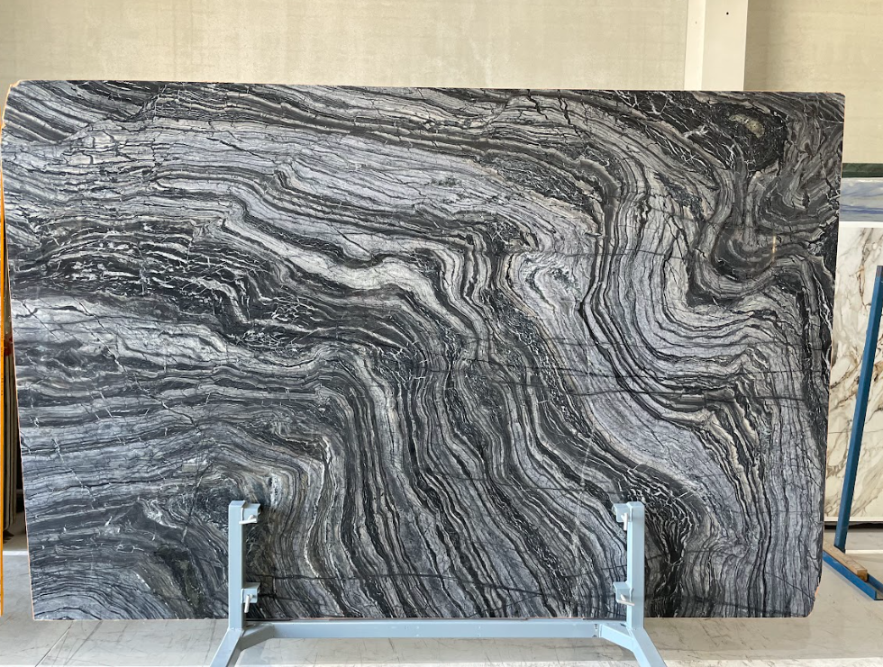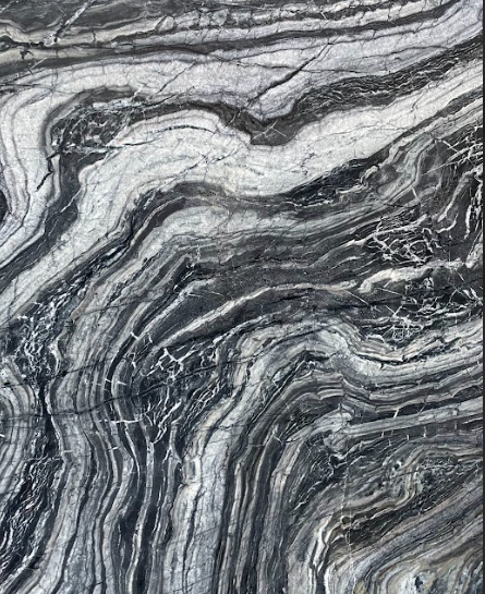 Mármol de tonalidades grises oscuras formando ondas a través de sus finas vetas. Uso recomendado para interiores.
