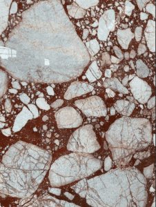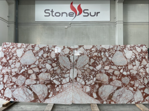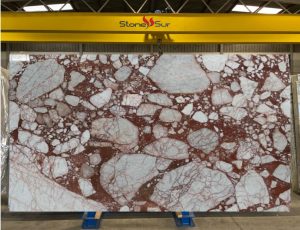 Este mármol destaca por su fondo rojo intenso, casi burdeos, adornado con grandes fragmentos blancos o beige y finas vetas rojizas. Su apariencia contrastante y sofisticada lo hace ideal para espacios donde se busca un diseño impactante. Adecuado para interiores.