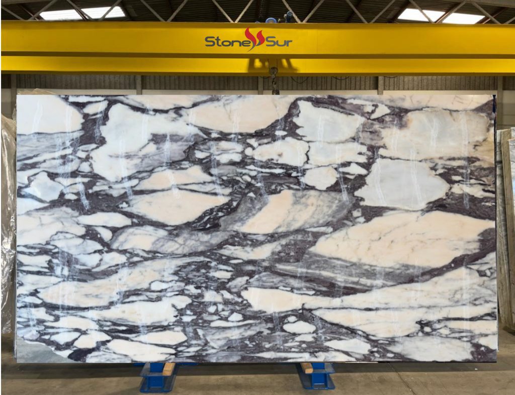 Mármol blanco de gran expresividad, atravesado por vetas gruesas en tonos burdeos y violetas que aportan un carácter artístico, sofisticado y muy exclusivo a cualquier espacio.